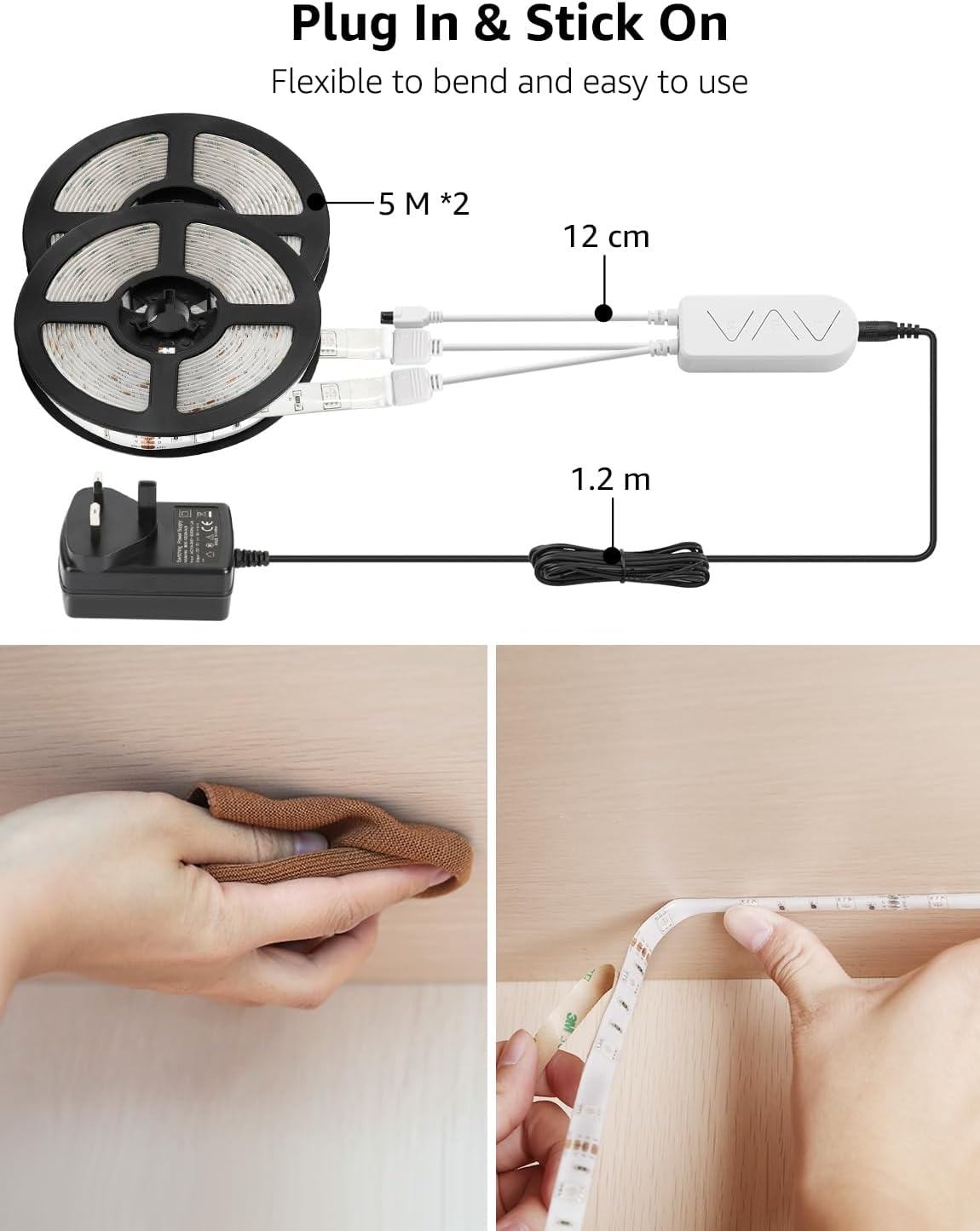 • Easy to Install and Use - No screws or drill making a mess just stick and go, and the all-in-one kit comes with all essential parts, simply plug and play without wiring. (Note: You can cut the strip light, but the 4pin 10mm connectors are not included)