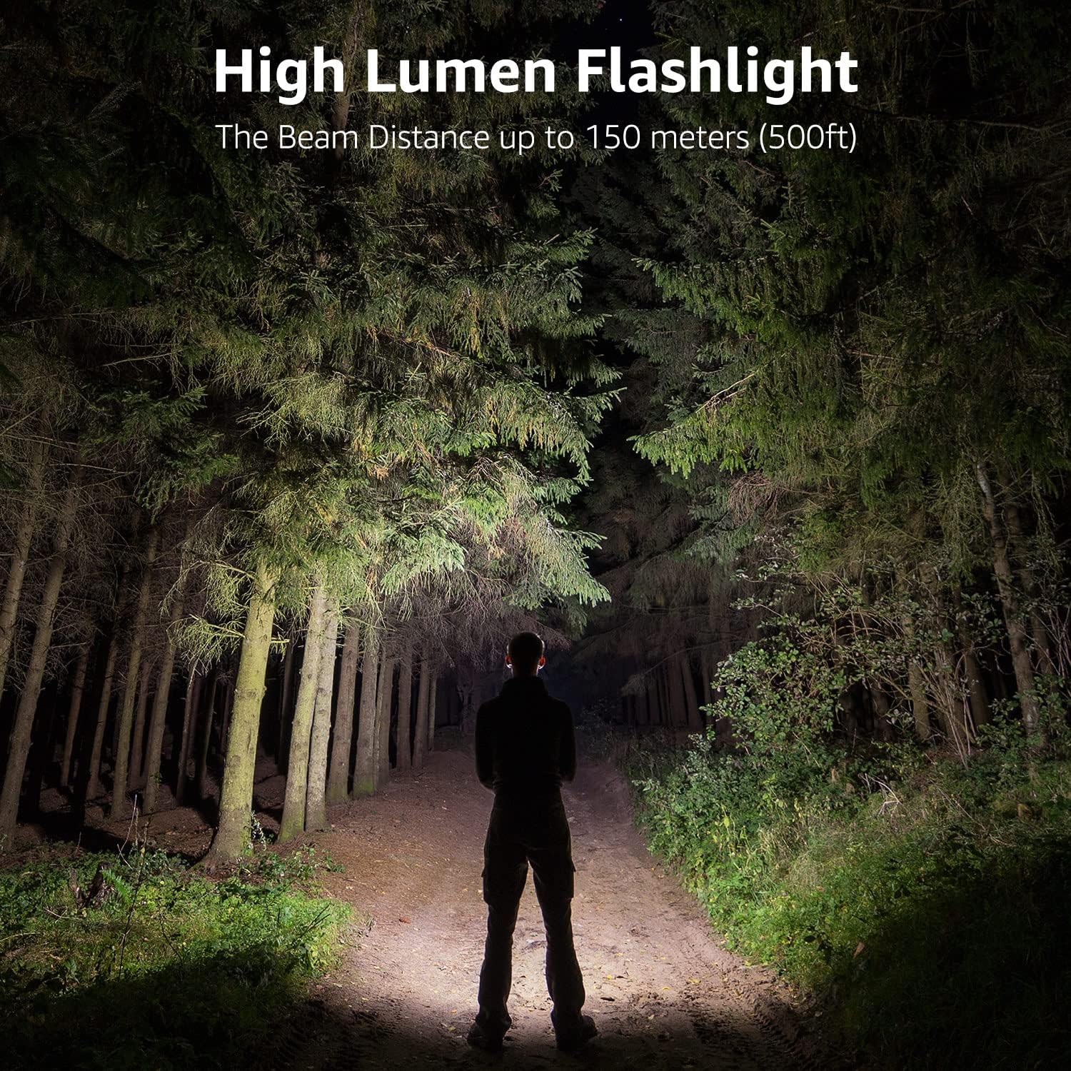 - Adjustable Focus - The zoomable LED flashlight can emit a perfectly focused spotlight beam at a distance of 150M or turn it into a bright large area floodlight by rotating the flashlight head.
