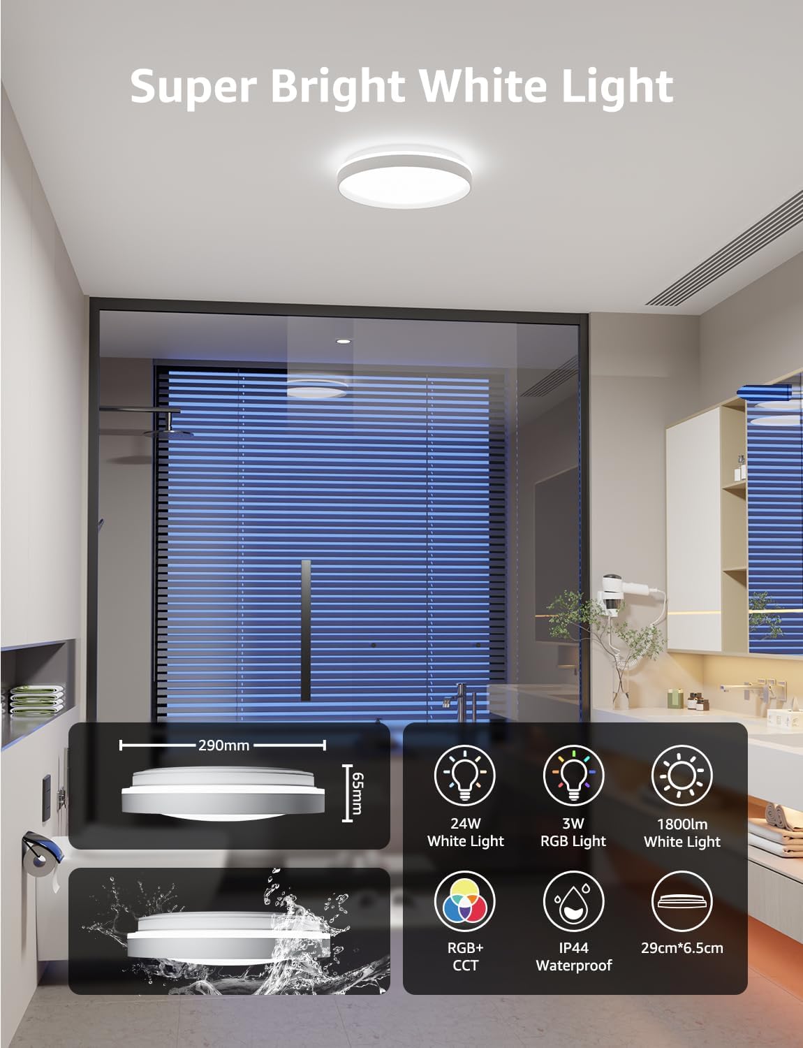 Lepro T1 AI Smart Ceiling Light 24W, Music Sync, Voice Control, AI Lighting Design Assistant, Waterproof Bathroom Light, Bluetooth WiFi Color Changing Ceiling Light, Work with Alexa, Google Home, 29CM